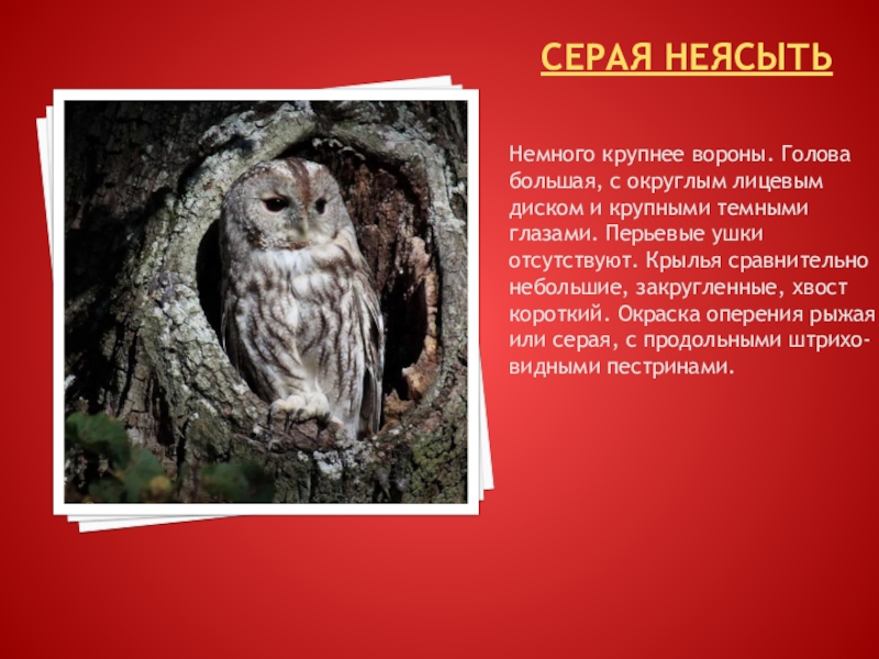 Немного крупнее вороны. Голова большая, с округлым лицевым диском и