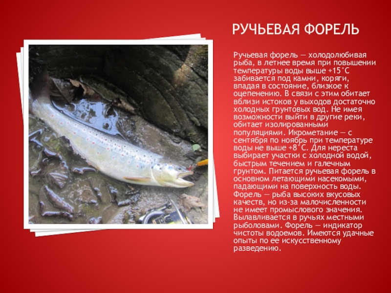 температуры воды выше +15°С забивается под камни, коряги, впадая в состояние, близкое к оцепенению. В связи с этим обитает вблизи истоков у выходов достаточно холодных грунтовых вод. Не имея возможности выйти в другие реки, обитает изолированными популяциями. Икрометание — с сентября по ноябрь при температуре воды не выше +8°С. Для нереста выбирает участки с холодной водой, быстрым течением и галечным грунтом. Питается ручьевая форель в основном летающими насекомыми, падающими на поверхность воды. Форель — рыба высоких вкусовых качеств, но из-за малочисленности не имеет промыслового значения. Вылавливается в ручьях местными рыболовами. Форель — индикатор чистоты водоемов. Имеются удачные опыты по ее искусственному разведению.