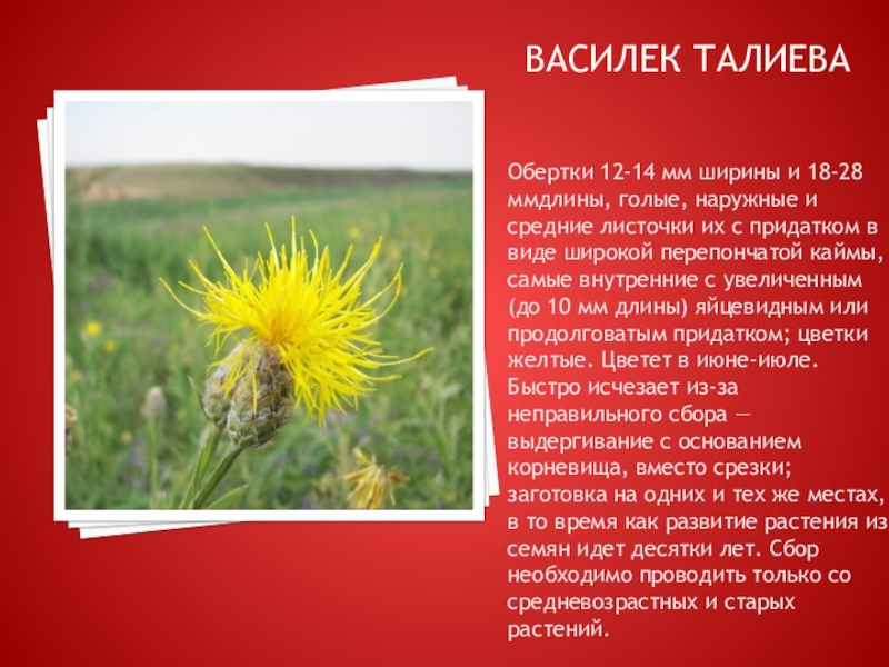 средние листочки их с придатком в виде широкой перепончатой каймы, самые внутренние с увеличенным (до 10 мм длины) яйцевидным или продолговатым придатком; цветки желтые. Цветет в июне-июле. Быстро исчезает из-за неправильного сбора — выдергивание с основанием корневища, вместо срезки; заготовка на одних и тех же местах, в то время как развитие растения из семян идет десятки лет. Сбор необходимо проводить только со средневозрастных и старых растений.