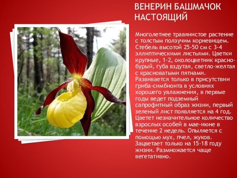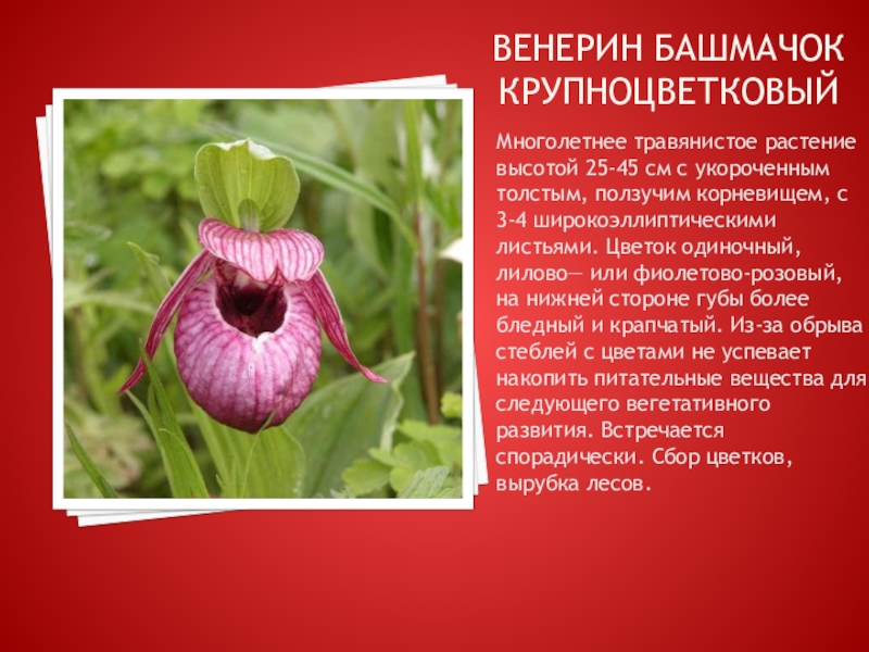Многолетнее травянистое растение высотой 25-45 см с укороченным толстым, ползучим корневищем, с 3-4 широкоэллиптическими листьями. Цветок одиночный, лилово— или фиолетово-розовый, на нижней стороне губы более бледный и крапчатый. Из-за обрыва стеблей с цветами не успевает накопить питательные вещества для следующего вегетативного развития. Встречается спорадически. Сбор цветков, вырубка лесов.