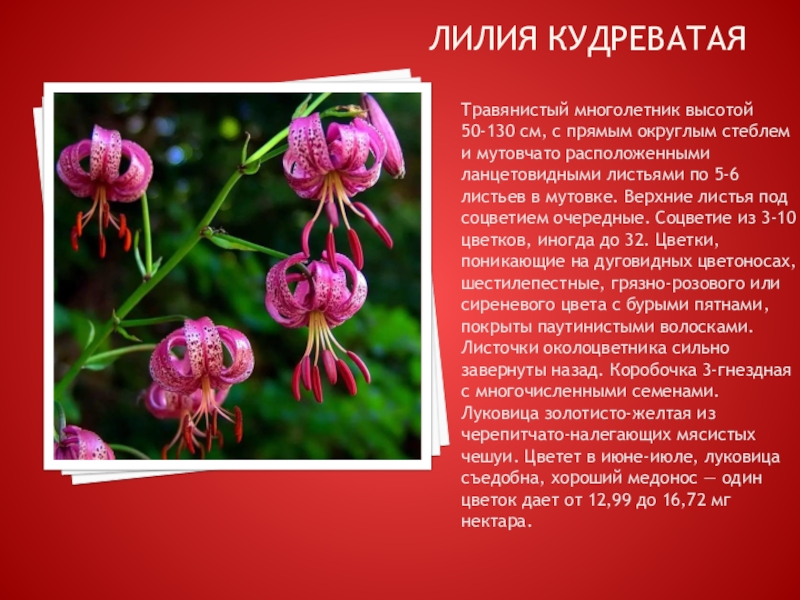 мутовчато расположенными ланцетовидными листьями по 5-6 листьев в мутовке. Верхние листья под соцветием очередные. Соцветие из 3-10 цветков, иногда до 32. Цветки, поникающие на дуговидных цветоносах, шестилепестные, грязно-розового или сиреневого цвета с бурыми пятнами, покрыты паутинистыми волосками. Листочки околоцветника сильно завернуты назад. Коробочка 3-гнездная с многочисленными семенами. Луковица золотисто-желтая из черепитчато-налегающих мясистых чешуи. Цветет в июне-июле, луковица съедобна, хороший медонос — один цветок дает от 12,99 до 16,72 мг нектара.