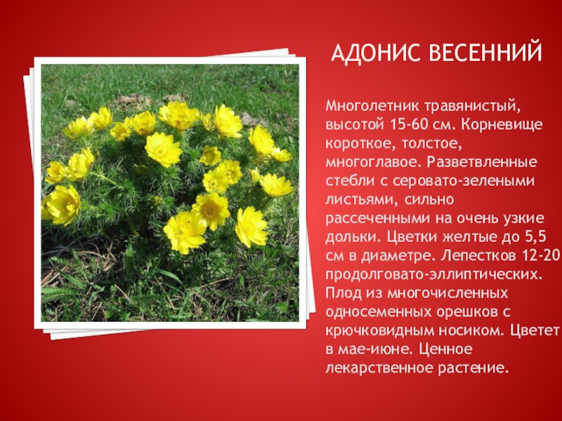 стебли с серовато-зелеными листьями, сильно рассеченными на очень узкие дольки. Цветки желтые до 5,5 см в диаметре. Лепестков 12-20 продолговато-эллиптических. Плод из многочисленных односеменных орешков с крючковидным носиком. Цветет в мае-июне. Ценное лекарственное растение.