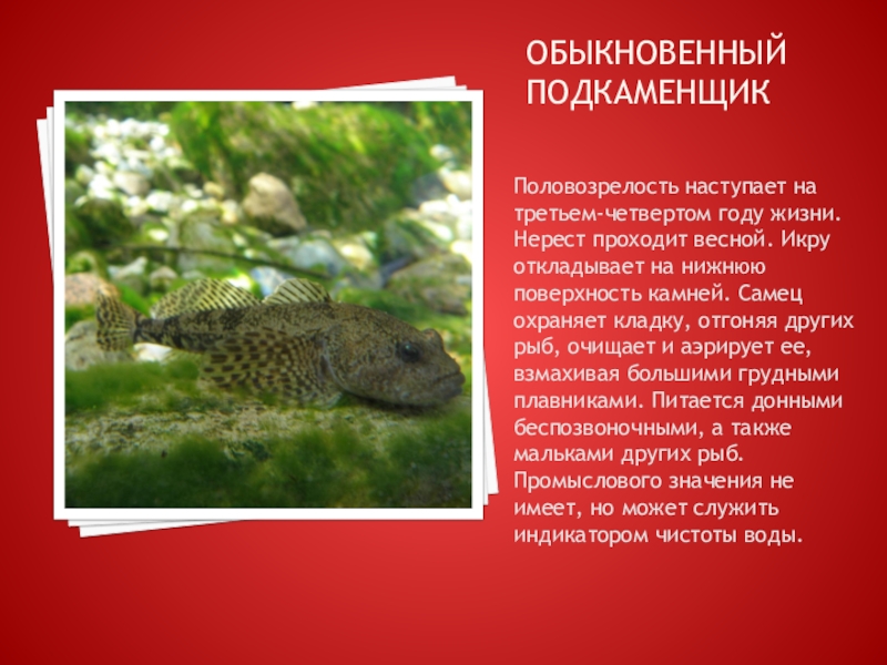 откладывает на нижнюю поверхность камней. Самец охраняет кладку, отгоняя других рыб, очищает и аэрирует ее, взмахивая большими грудными плавниками. Питается донными беспозвоночными, а также мальками других рыб. Промыслового значения не имеет, но может служить индикатором чистоты воды.