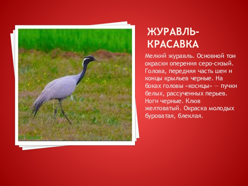 Мелкий журавль. Основной тон окраски оперения серо-сизый. Голова, передняя часть шеи
