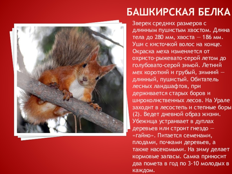 280 мм, хвоста — 186 мм. Уши с кисточкой волос на конце. Окраска меха изменяется от охристо-рыжевато-серой летом до голубовато-серой зимой. Летний мех короткий и грубый, зимний — длинный, пушистый. Обитатель лесных ландшафтов, придерживается старых боров и широколиственных лесов. На Урале заходит в лесостепь и степные боры (2). Ведет дневной образ жизни. Убежища устраивает в дуплах деревьев или строит гнездо — «гайно». Питается семенами, плодами, почками деревьев, а также насекомыми. На зиму делает кормовые запасы. Самка приносит два помета в год по 3-10 молодых в каждом.