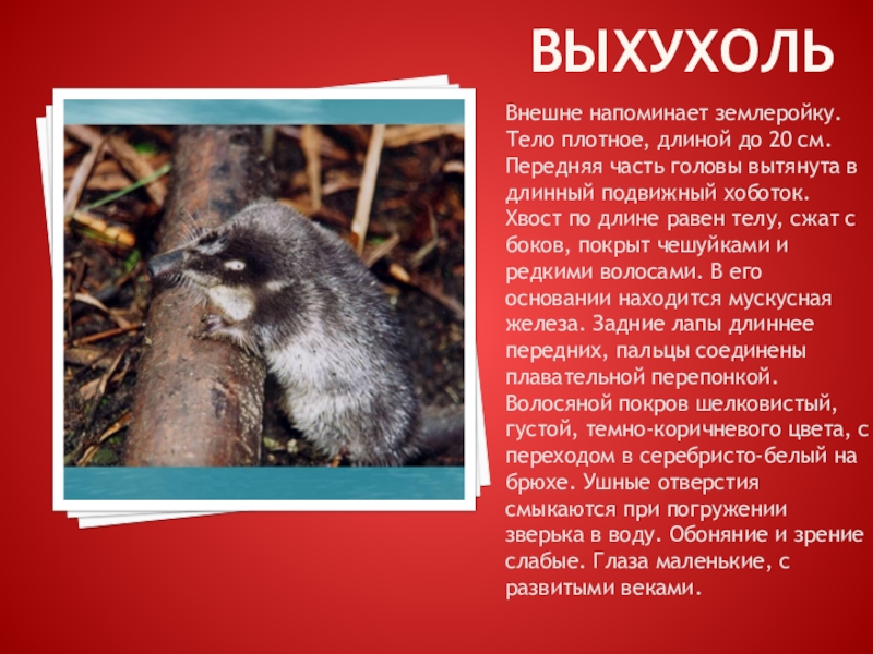 головы вытянута в длинный подвижный хоботок. Хвост по длине равен телу, сжат с боков, покрыт чешуйками и редкими волосами. В его основании находится мускусная железа. Задние лапы длиннее передних, пальцы соединены плавательной перепонкой. Волосяной покров шелковистый, густой, темно-коричневого цвета, с переходом в серебристо-белый на брюхе. Ушные отверстия смыкаются при погружении зверька в воду. Обоняние и зрение слабые. Глаза маленькие, с развитыми веками.