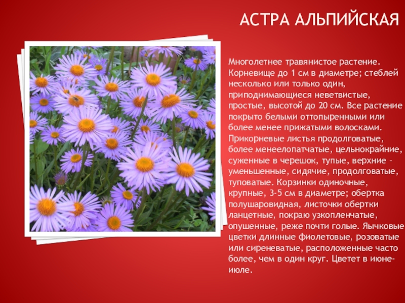 несколько или только один, приподнимающиеся неветвистые, простые, высотой до 20 см. Все растение покрыто белыми оттопыренными или более менее прижатыми волосками. Прикорневые листья продолговатые, более менеелопатчатые, цельнокрайние, суженные в черешок, тупые, верхние – уменьшенные, сидячие, продолговатые, туповатые. Корзинки одиночные, крупные, 3-5 см в диаметре; обертка полушаровидная, листочки обертки ланцетные, покраю узкопленчатые, опушенные, реже почти голые. Яычковые цветки длинные фиолетовые, розоватые или сиреневатые, расположенные часто более, чем в один круг. Цветет в июне-июле.