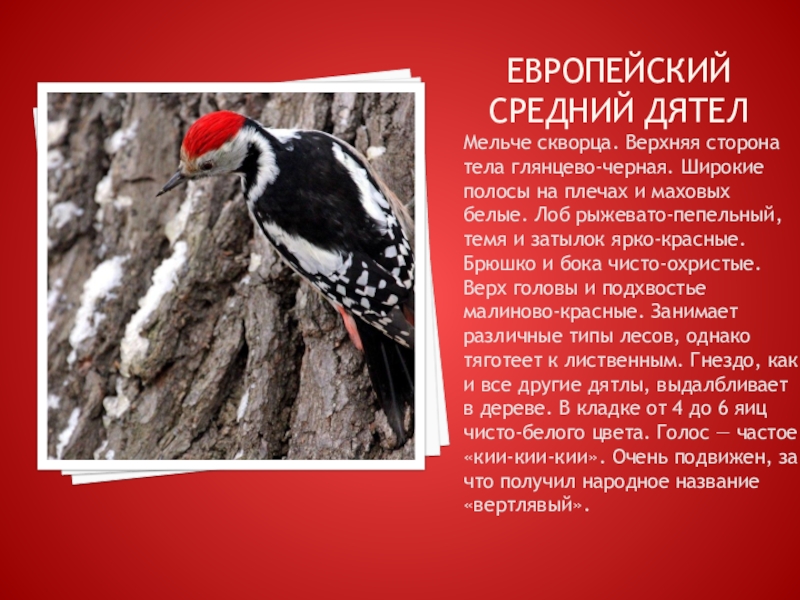 плечах и маховых белые. Лоб рыжевато-пепельный, темя и затылок ярко-красные. Брюшко и бока чисто-охристые. Верх головы и подхвостье малиново-красные. Занимает различные типы лесов, однако тяготеет к лиственным. Гнездо, как и все другие дятлы, выдалбливает в дереве. В кладке от 4 до 6 яиц чисто-белого цвета. Голос — частое «кии-кии-кии». Очень подвижен, за что получил народное название «вертлявый».