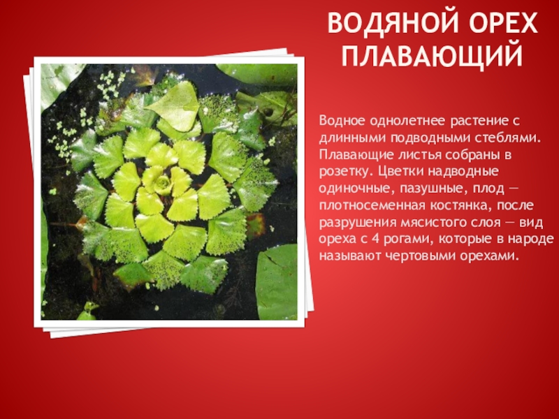 в розетку. Цветки надводные одиночные, пазушные, плод — плотносеменная костянка, после разрушения мясистого слоя — вид ореха с 4 рогами, которые в народе называют чертовыми орехами.