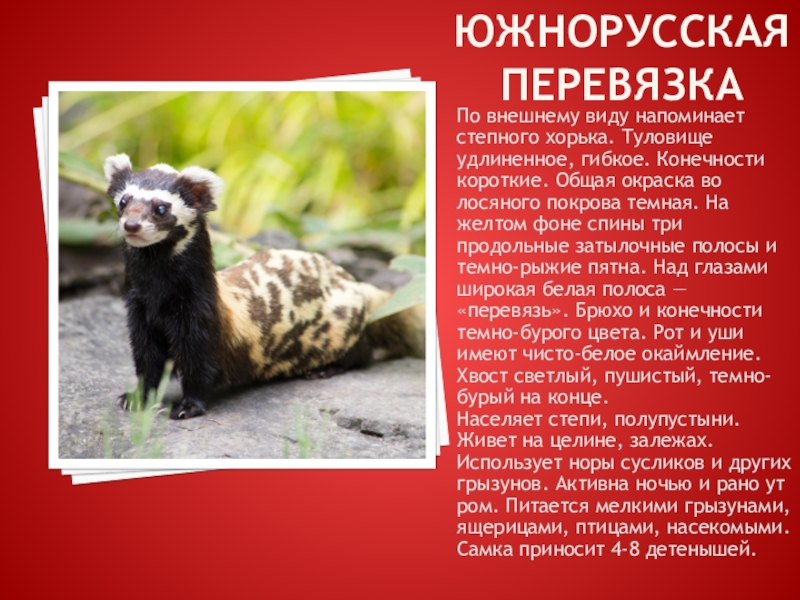 По внешнему виду напоминает степного хорька. Туловище удлиненное, гибкое. Конечности