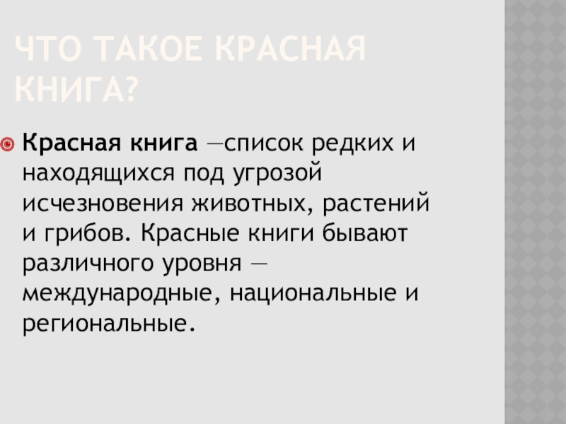 исчезновения животных, растений и грибов. Красные книги бывают различного уровня — международные, национальные и региональные.