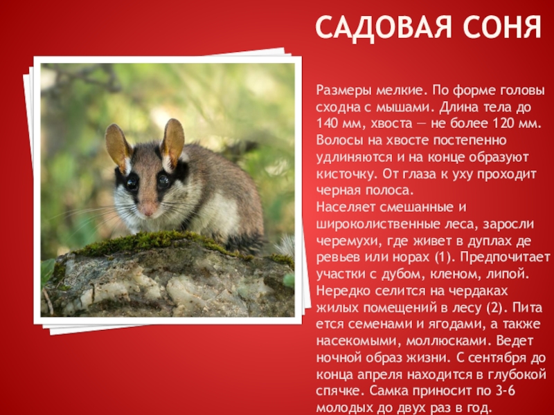 Населяет смешанные и широколиственные леса, заросли черемухи, где живет в дуплах деревьев или норах (1). Предпочитает участки с дубом, кленом, липой. Нередко селится на чердаках жилых помещений в лесу (2). Питается семенами и ягодами, а также насекомыми, моллюсками. Ведет ночной образ жизни. С сентября до конца апреля находится в глубокой спячке. Самка приносит по 3-6 молодых до двух раз в год.