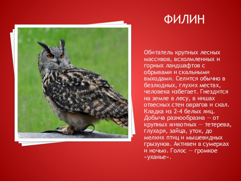 и скальными выходами. Селится обычно в безлюдных, глухих местах, человека избегает. Гнездится на земле в лесу, в нишах отвесных стен оврагов и скал. Кладка из 2-4 белых яиц. Добыча разнообразна — от крупных животных — тетерева, глухаря, зайца, уток, до мелких птиц и мышевидных грызунов. Активен в сумерках и ночью. Голос — громкое «уханье».