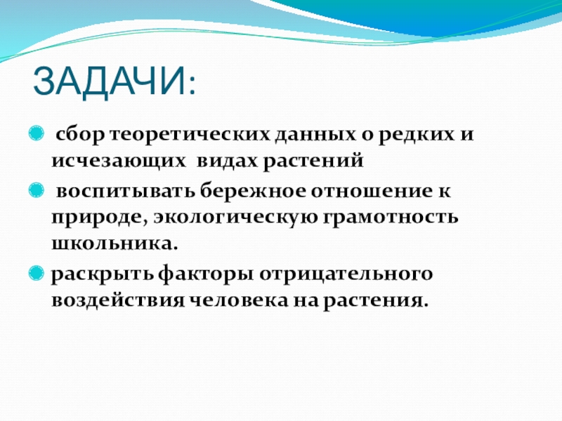ЗАДАЧИ: сбор теоретических данных о редких и исчезающих видах растений воспитывать бережное отношение к природе, экологическую грамотность