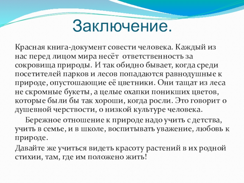 Заключение. Красная книга-документ совести человека. Каждый из нас перед лицом мира несёт ответственность за сокровища природы. И