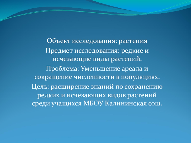 Объект исследования: растенияПредмет исследования: редкие и исчезающие виды растений.Проблема: Уменьшение ареала и сокращение численности в популяциях.Цель: расширение
