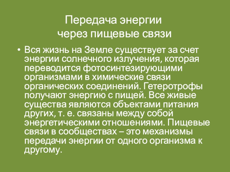 энергии солнечного излучения, которая переводится фотосинтезирующими организмами в химические связи органических соединений. Гетеротрофы получают энергию с пищей. Все живые существа являются объектами питания других, т. е. связаны между собой энергетическими отношениями. Пищевые связи в сообществах – это механизмы передачи энергии от одного организма к другому.