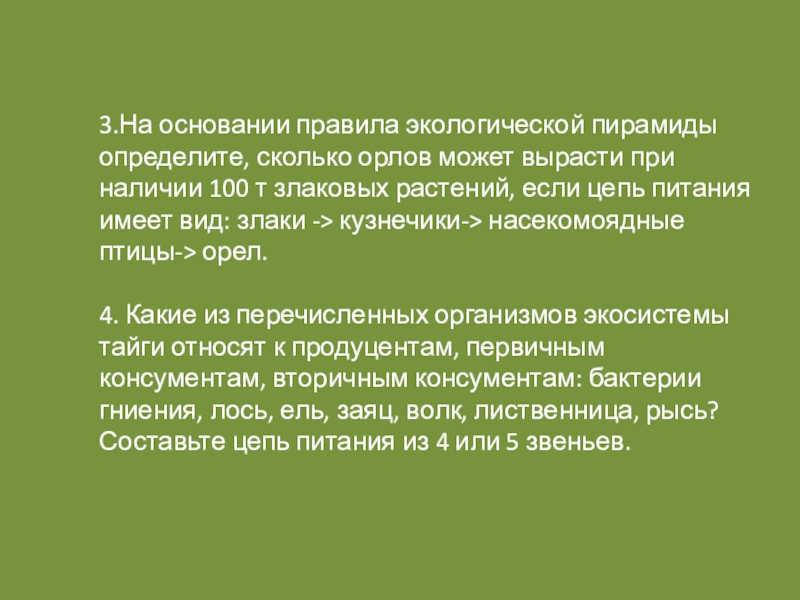 Слайд 273.На основании правила экологической пирамиды определите, сколько орлов может вырасти при