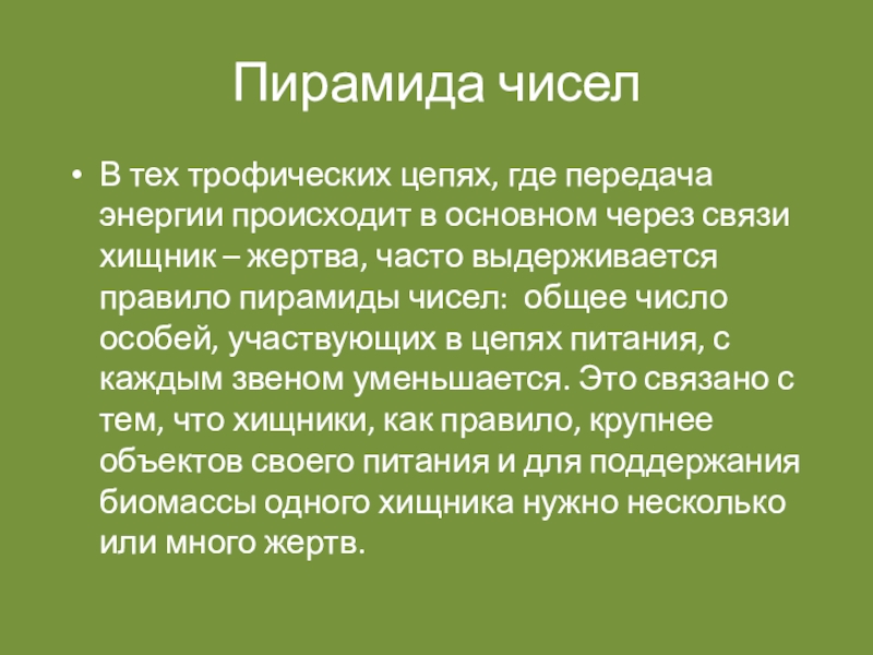 через связи хищник – жертва, часто выдерживается правило пирамиды чисел: общее число особей, участвующих в цепях питания, с каждым звеном уменьшается. Это связано с тем, что хищники, как правило, крупнее объектов своего питания и для поддержания биомассы одного хищника нужно несколько или много жертв.