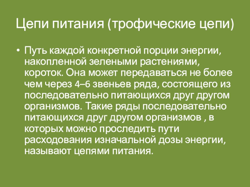 короток. Она может передаваться не более чем через 4–6 звеньев ряда, состоящего из последовательно питающихся друг другом организмов. Такие ряды последовательно питающихся друг другом организмов , в которых можно проследить пути расходования изначальной дозы энергии, называют цепями питания.
