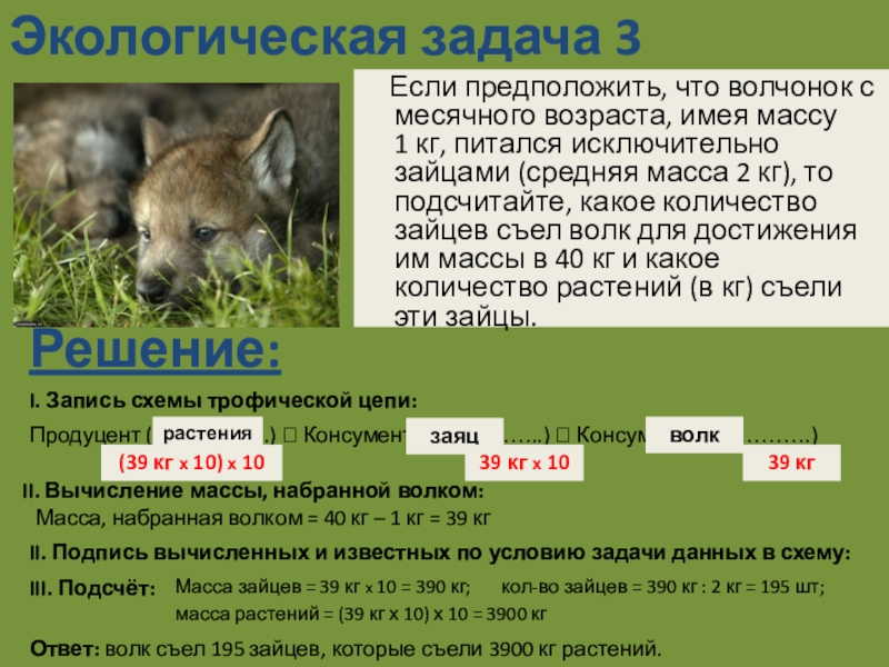 имея массу 1 кг, питался исключительно зайцами (средняя масса 2 кг), то подсчитайте, какое количество зайцев съел волк для достижения им массы в 40 кг и какое количество растений (в кг) съели эти зайцы.