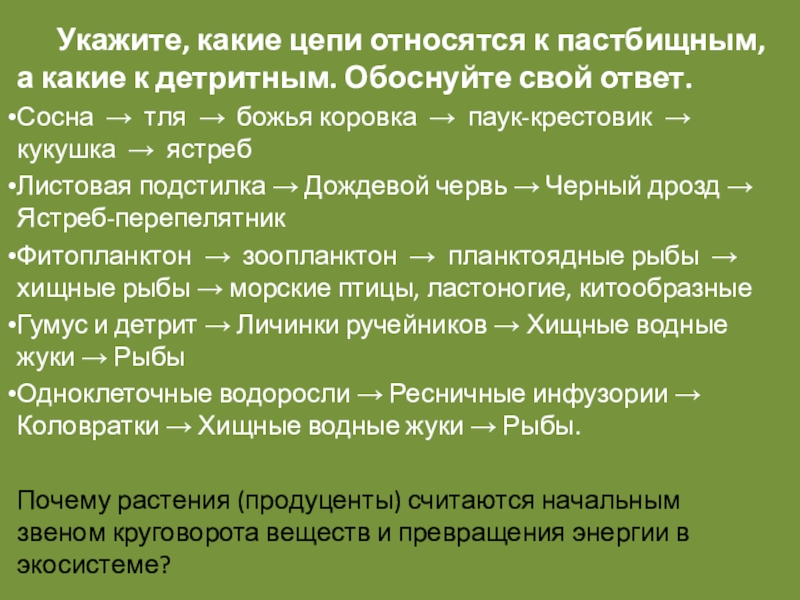 Слайд 22 Укажите, какие цепи относятся к пастбищным, а какие к детритным. Обоснуйте