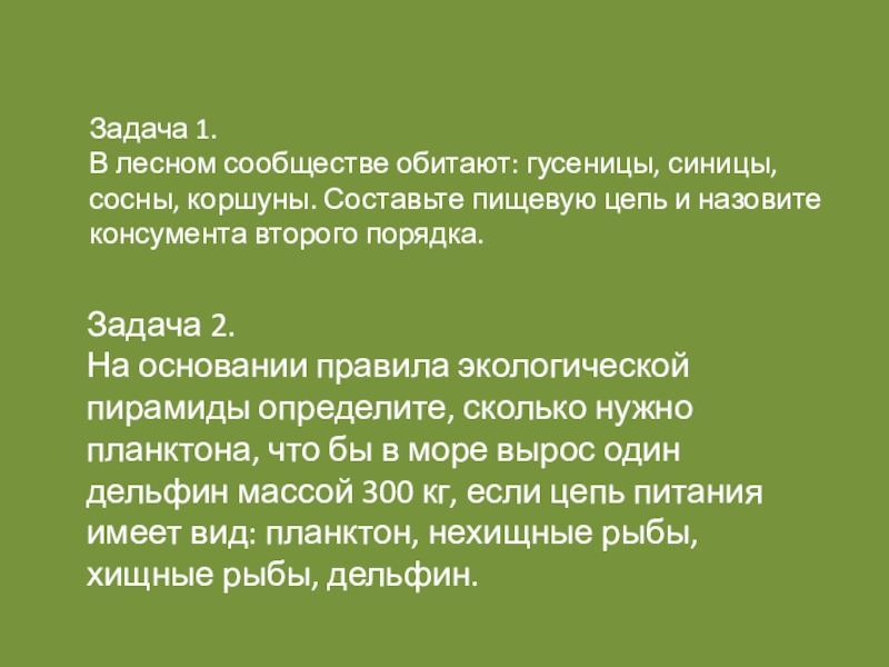 Пример: На основании правила экологической пирамиды определите, сколько нужно планктона, что бы в море вырос один дельфин массой 300 кг, если цепь питания имеет вид: планктон, нехищные рыбы, хищные рыбы, дельфин.