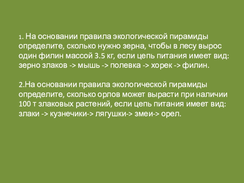 Задача 1. На основании правила экологической пирамиды определите, сколько нужно зерна, чтобы в лесу вырос один филин массой 3.5 кг, если цепь питания имеет вид: зерно злаков -> мышь полевка -> хорек -> филин.