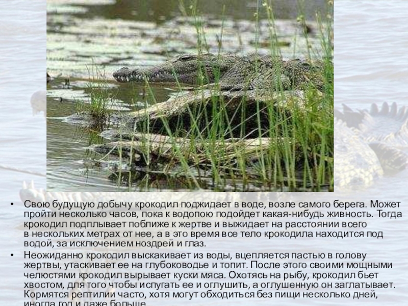 несколько часов, пока к водопою подойдет какая-нибудь живность. Тогда крокодил подплывает поближе к жертве и выжидает на расстоянии всего в нескольких метрах от нее, а в это время все тело крокодила находится под водой, за исключением ноздрей и глаз.