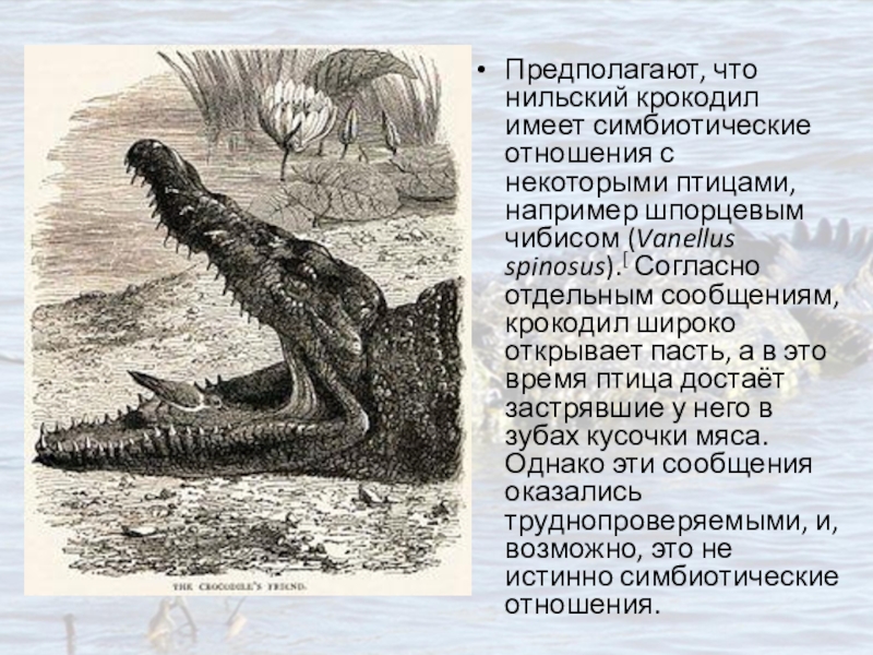 Предполагают, что нильский крокодил имеет симбиотические отношения с некоторыми птицами, например