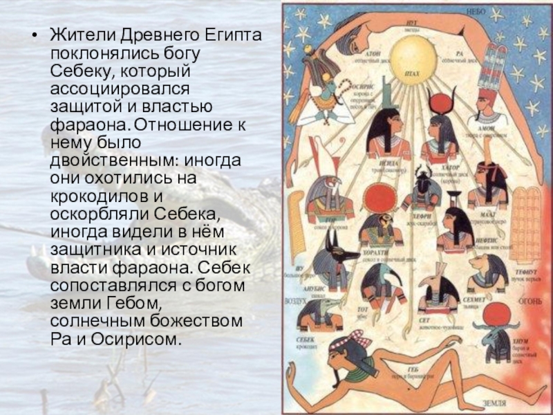 фараона. Отношение к нему было двойственным: иногда они охотились на крокодилов и оскорбляли Себека, иногда видели в нём защитника и источник власти фараона. Себек сопоставлялся с богом земли Гебом, солнечным божеством Ра и Осирисом.