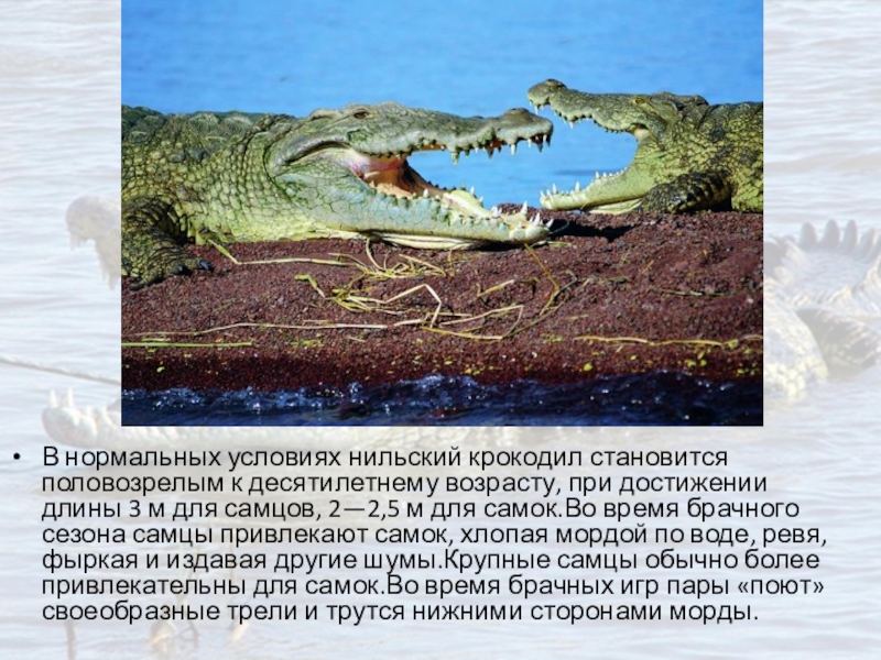 В нормальных условиях нильский крокодил становится половозрелым к десятилетнему возрасту, при