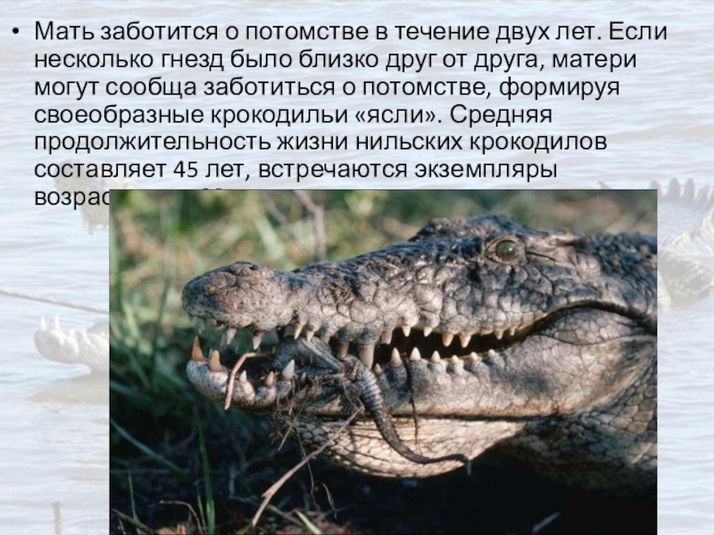 было близко друг от друга, матери могут сообща заботиться о потомстве, формируя своеобразные крокодильи «ясли». Средняя продолжительность жизни нильских крокодилов составляет 45 лет, встречаются экземпляры возрастом до 80 лет.