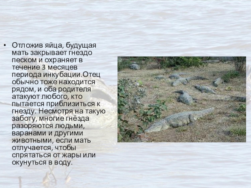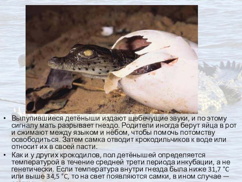 гнездо. Родители иногда берут яйца в рот и сжимают между языком и нёбом, чтобы помочь потомству освободиться. Затем самка отводит крокодильчиков к воде или относит их в своей пасти.