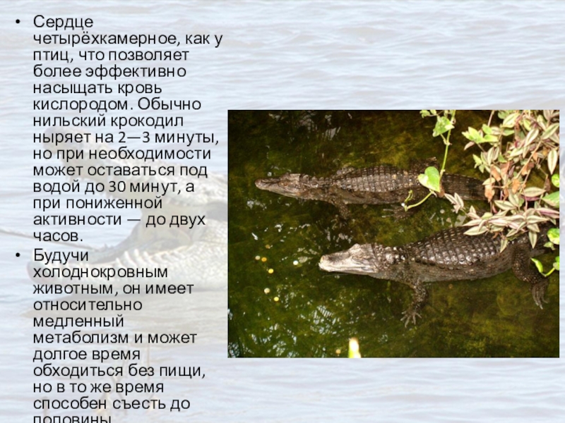кислородом. Обычно нильский крокодил ныряет на 2—3 минуты, но при необходимости может оставаться под водой до 30 минут, а при пониженной активности — до двух часов.