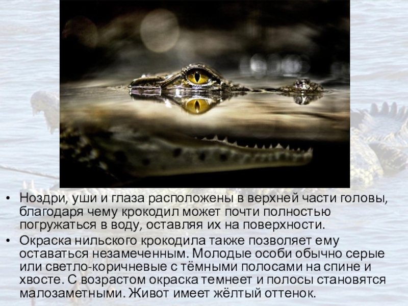 крокодил может почти полностью погружаться в воду, оставляя их на поверхности.
