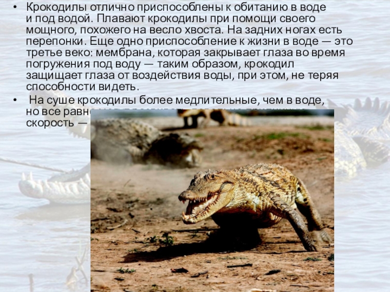 Крокодилы отлично приспособлены к обитанию в воде и под водой. Плавают крокодилы при помощи