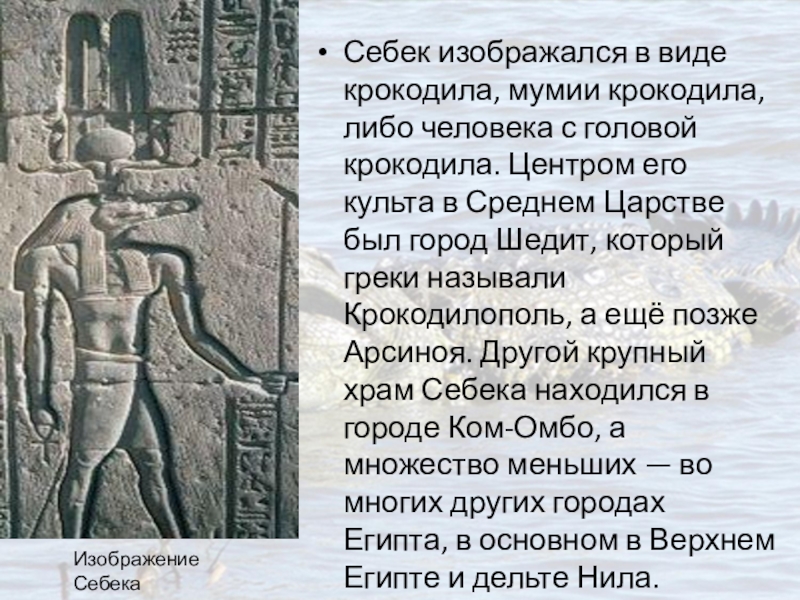 Себек изображался в виде крокодила, мумии крокодила, либо человека с головой