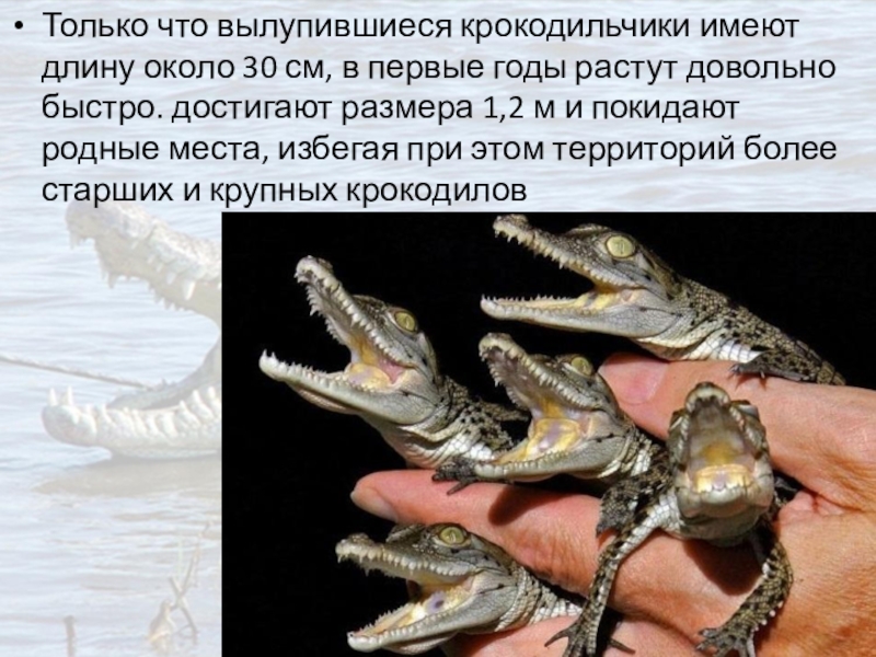 Только что вылупившиеся крокодильчики имеют длину около 30 см, в первые годы