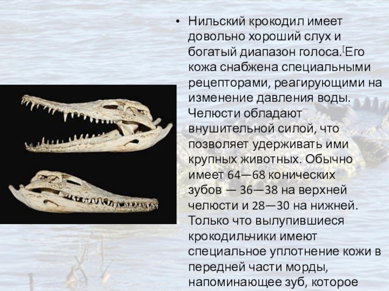 Нильский крокодил имеет довольно хороший слух и богатый диапазон голоса.[Его кожа