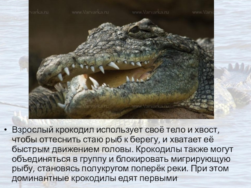 к берегу, и хватает её быстрым движением головы. Крокодилы также могут объединяться в группу и блокировать мигрирующую рыбу, становясь полукругом поперёк реки. При этом доминантные крокодилы едят первыми.