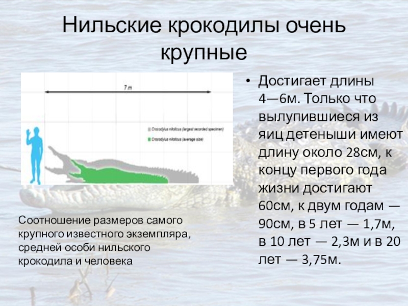 Соотношение размеров самого крупного известного экземпляра, средней особи нильского крокодила и человека