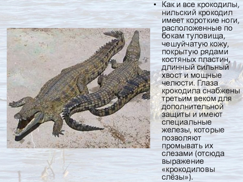 бокам туловища, чешуйчатую кожу, покрытую рядами костяных пластин, длинный сильный хвост и мощные челюсти. Глаза крокодила снабжены третьим веком для дополнительной защиты и имеют специальные железы, которые позволяют промывать их слезами (отсюда выражение «крокодиловы слёзы»).