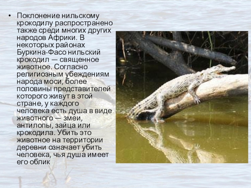 Поклонение нильскому крокодилу распространено также среди многих других народов Африки. В