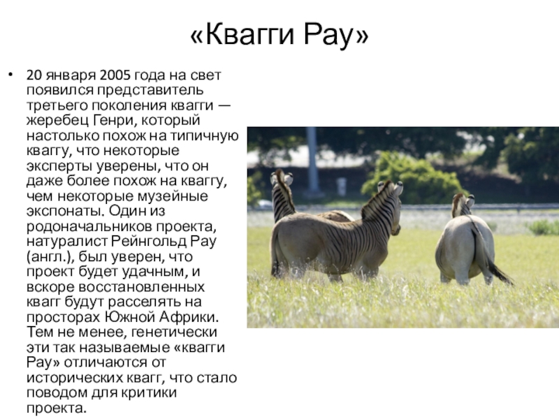 квагги — жеребец Генри, который настолько похож на типичную кваггу, что некоторые эксперты уверены, что он даже более похож на кваггу, чем некоторые музейные экспонаты. Один из родоначальников проекта, натуралист Рейнгольд Рау (англ.), был уверен, что проект будет удачным, и вскоре восстановленных квагг будут расселять на просторах Южной Африки. Тем не менее, генетически эти так называемые «квагги Рау» отличаются от исторических квагг, что стало поводом для критики проекта.