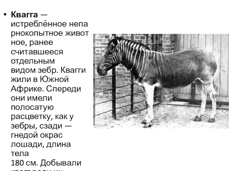 Слайд 2Квагга — истреблённое непарнокопытное животное, ранее считавшееся отдельным видом зебр. Квагги жили в Южной Африке.