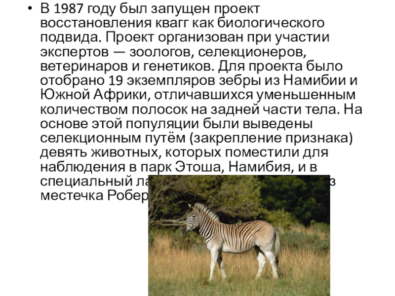 Слайд 4В 1987 году был запущен проект восстановления квагг как биологического подвида.