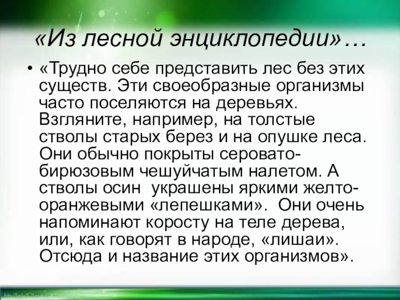 «Из лесной энциклопедии»…«Трудно себе представить лес без этих существ. Эти своеобразные организмы часто поселяются на деревьях. Взгляните,