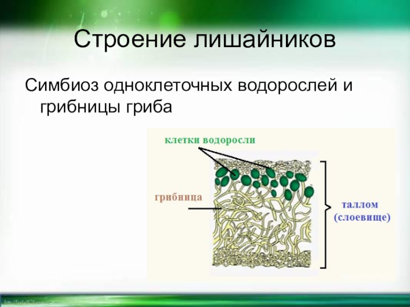 Строение лишайниковСимбиоз одноклеточных водорослей и грибницы гриба