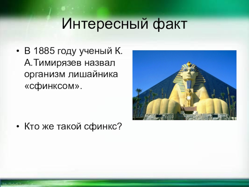 Интересный фактВ 1885 году ученый К.А.Тимирязев назвал организм лишайника «сфинксом».Кто же такой сфинкс?